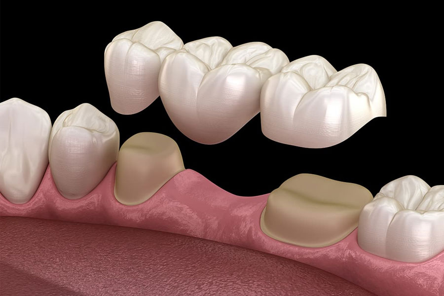 In diesem Fall wird der Zahn vor und hinter dieser Lücke (eventuell auch mehrere Zähne wenn bereits eine größere Zahnlücke besteht) wie bei der Krone beschrieben beschliffen und der Zahntechniker stellt 2 Zahnkronen her die durch ein (oder mehrere) Mittelglied/er miteinander verbunden sind.