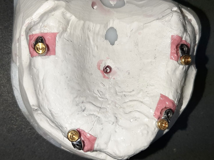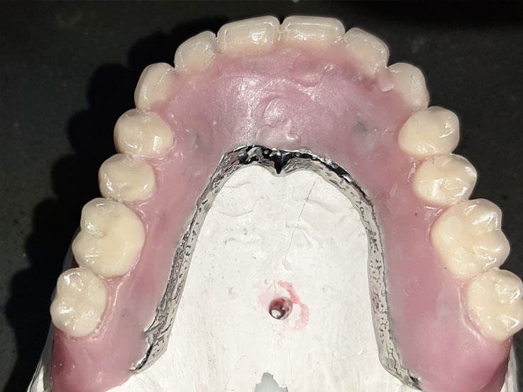 Neue Technologien bei der Keramikverarbeitung ermöglichen mittlerweile aber auch die CAD/CAM-Fertigung der Innenteleskopkronen aus Zirkonoxid-Keramik (weiß).